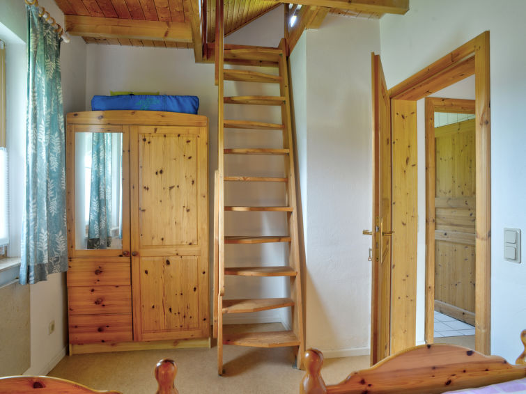 "Solling", 3-Zimmer-Haus 65 m2 auf 2 Stockwerken, im Erdgeschoss. Objekt geeignet für 4 Erwachsene + 2 Kinder. Gemütlich eingerichtet: Wohnzimmer mit Sat-TV, Radio und CD. 1 Zimmer mit 2 Betten. 1 Doppelzimmer. Offene Küche (4 Kochplatten, Backofen, Geschirrspüler, Mikrowelle, elektrische Kaffeemaschine) mit Esstisch. Dusche/WC. Obergeschoss: (Leiter) abgeschrägte, offene Galerie, Deckenhöhe 100 - 120 cm mit 2 Schlafmöglichkeiten. E-Heizung. Terrasse überdacht, Südlage. Terrassenmöbel, Abstellkammer. Zur Verfügung: Kinderhochstuhl, Haartrockner. Internet (Wireless LAN, gratis). Maximal 1 Haustier/Hund erlaubt. Zugang zur offene Galerie (Leiter, keine Stehhöhe) durch das Zweibettzimmer. Anstelle eines abgeschlossenen Schlafzimmers befinden sich manche Schlafplätze in einem offenen Bereich (Galerie, Nische etc.).