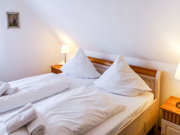 2-Zimmer-Wohnung 40 m2, im Obergeschoss. Gemütlich eingerichtet: Wohn-/Esszimmer 17 m2 mit 1 Diwanbett (140 cm, Länge 200 cm), Sat-TV (Flachbildschirm), Radio. 1 Zimmer 9 m2 mit 1 Doppelbett (2 x 90 cm, Länge 200 cm). Kochnische (4 Glaskeramikplatten, Toaster, Wasserkocher, Mikrowelle, elektrische Kaffeemaschine, Kombinationsmikrowelle). Dusche/WC. Balkon. Balkonmöbel. Zur Verfügung: Kinderhochstuhl (extra). Bitte beachten: Nichtraucher-Unterkunft.