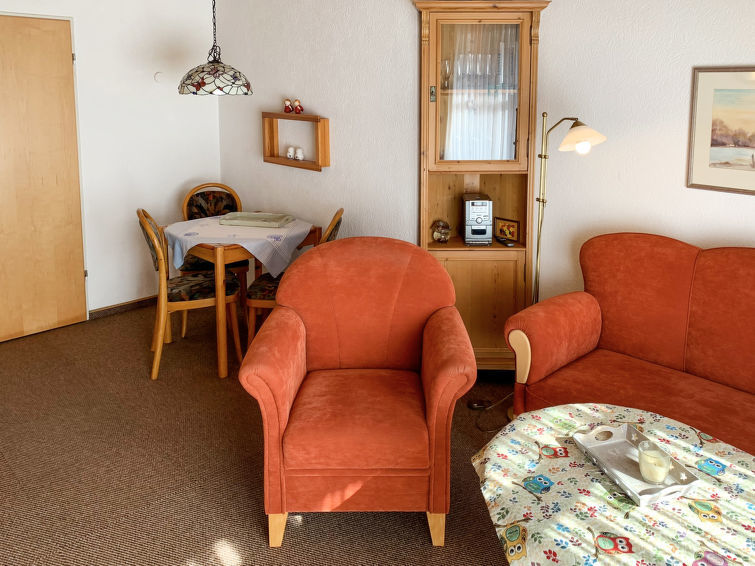 2-Zimmer-Wohnung 35 m2, im Erdgeschoss. Gemütlich eingerichtet: Wohn-/Esszimmer 15 m2 mit Digital-TV, Flachbildschirm und Stereoanlage. Ausgang zur Terrasse. 1 Zimmer 8 m2 mit 1 Doppelbett (2 x 80 cm, Länge 200 cm). Kochnische (2 Kochplatten, Toaster, Wasserkocher, Mikrowelle, elektrische Kaffeemaschine). Dusche/WC. Terrasse. Terrassenmöbel. Zur Verfügung: Telefon (extra), Kinderhochstuhl (extra), Haartrockner. Bitte beachten: Kühlschrank ohne Gefrierfach, Nichtraucher-Unterkunft. Rauchmelder.