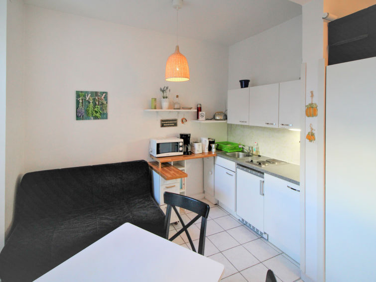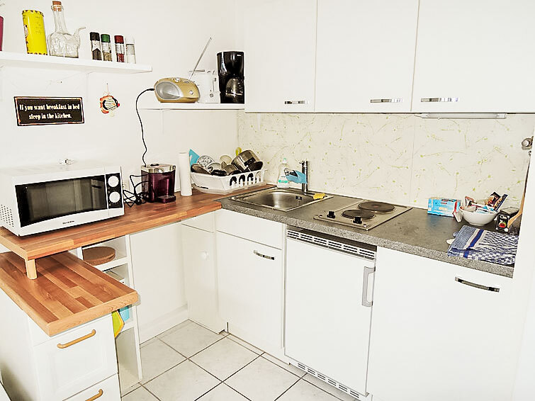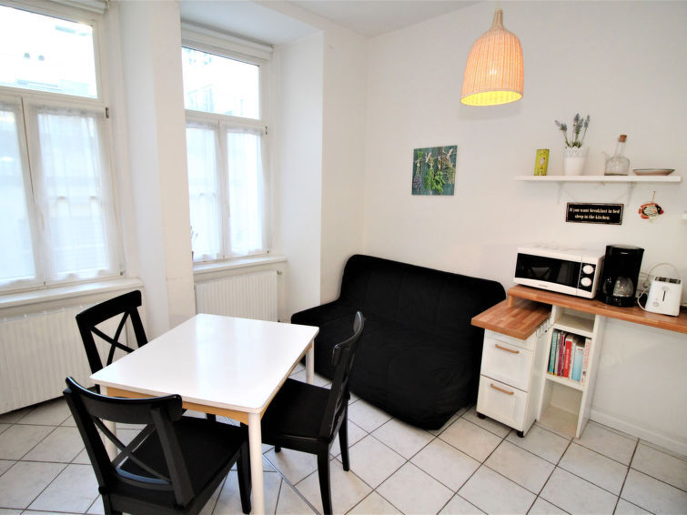 Appartement 2-kamers 40 m2 op de 2e verdieping. Smaakvol en gezellig ingericht: woon-/slaapkamer met 1 2-pers bed (180 cm), TV (Flatscreen TV). Open keuken (2-pits kookplaat, magnetron, elektrische koffiemachine) met eettafel, 1 opklapbed (140 cm), radio en CD-speler. Douche/WC. Verwarming. Ter beschikking: strijkijzer, haardroger. Internet (WiFi, gratis). Geschikt voor families. Niet rokers woning.