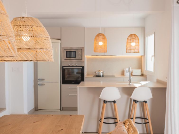 "Son Bou Sunset 49", huis 3-kamers 125 m2. Het objekt is geschikt voor 4 volwassenen. Modern en gezellig ingericht: woonkamer met Sat-TV en Flatscreen TV. 1 2-pers. kamer met 2 bedden (90 cm, lengte 200 cm). 1 2-pers. kamer met 1 bed (150 cm, lengte 200 cm). Open keuken (3-pits kookplaat, oven, broodrooster, magnetron, diepvriezer, elektrische koffiemachine) met eettafel. Douche/WC, bidet. Uitzicht op zee. Ter beschikking: wasmachine, strijkijzer, kinderbed tot 2 jaar, haardroger. Internet (WiFi, gratis). 125/1986 // Reg. Nr.: ESFCTU00000701300043474700000000000000000000125/19863