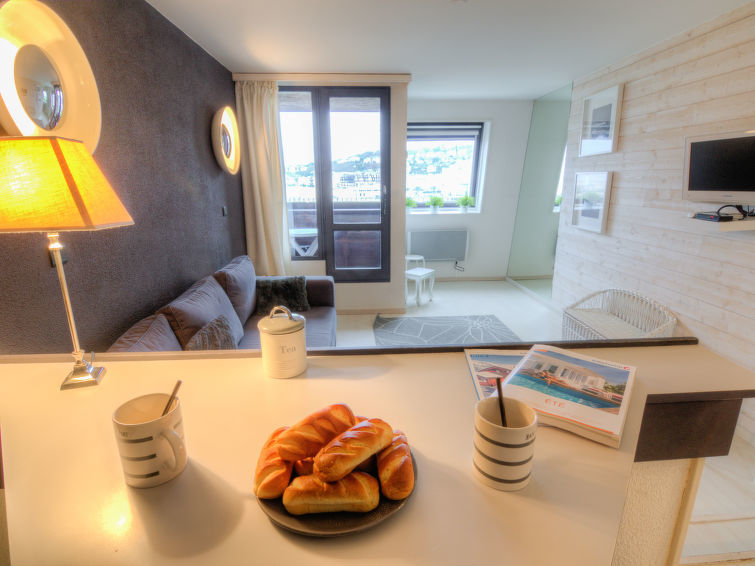 Studio 1-kamer 25 m2 op de 5e verdieping, op het oosten gelegen. Modern ingericht: hal met 1 x 2 stapelbedden (80 cm, lengte 180 cm). Woon-/eetkamer met 1 2-pers divanbed (1 x 140 cm, lengte 190 cm), TV (Flatscreen TV), DVD. Uitgang naar het balkon. Kookhoek (afwasmachine, 2 keramische glas kookplaten, broodrooster, waterkoker, elektrische koffiemachine, combimagnetron). Bad/WC. Elektrische verwarming. Klein balkon 2 m2. Balkonmeubilair. Mooi uitzicht op zee en de plaats. Ter beschikking: Internet (Internet (WiFi), gratis). Rookmelders. 14220 000121 J6